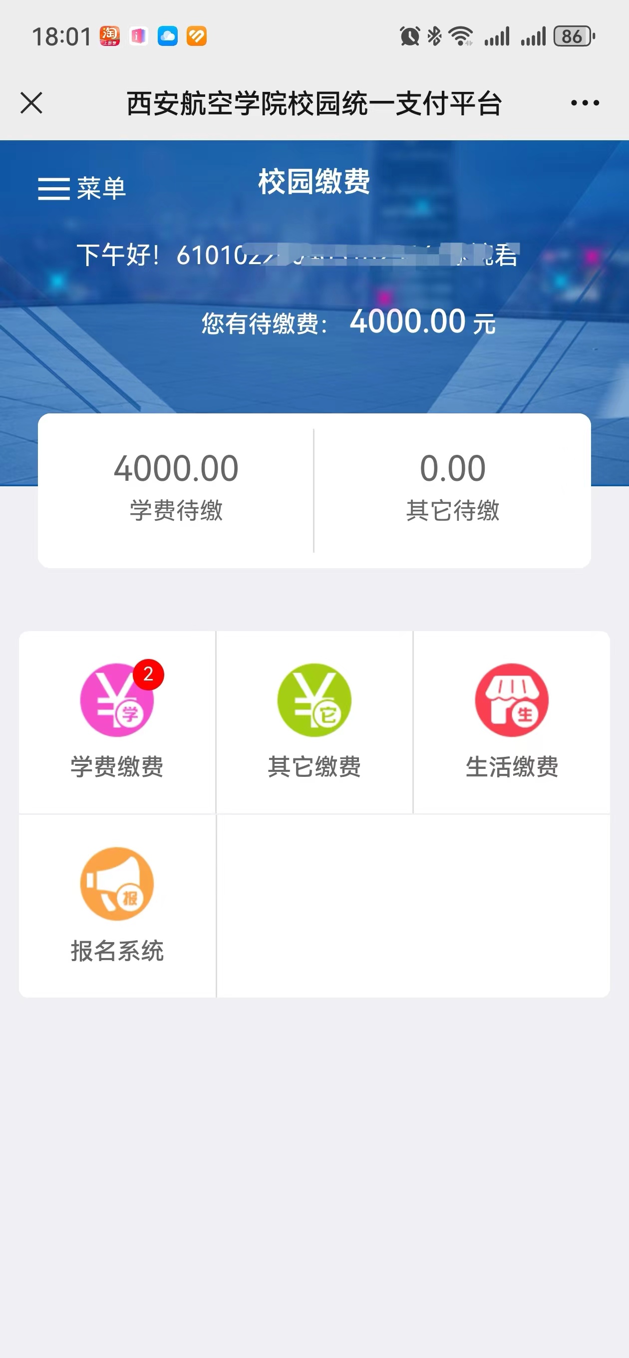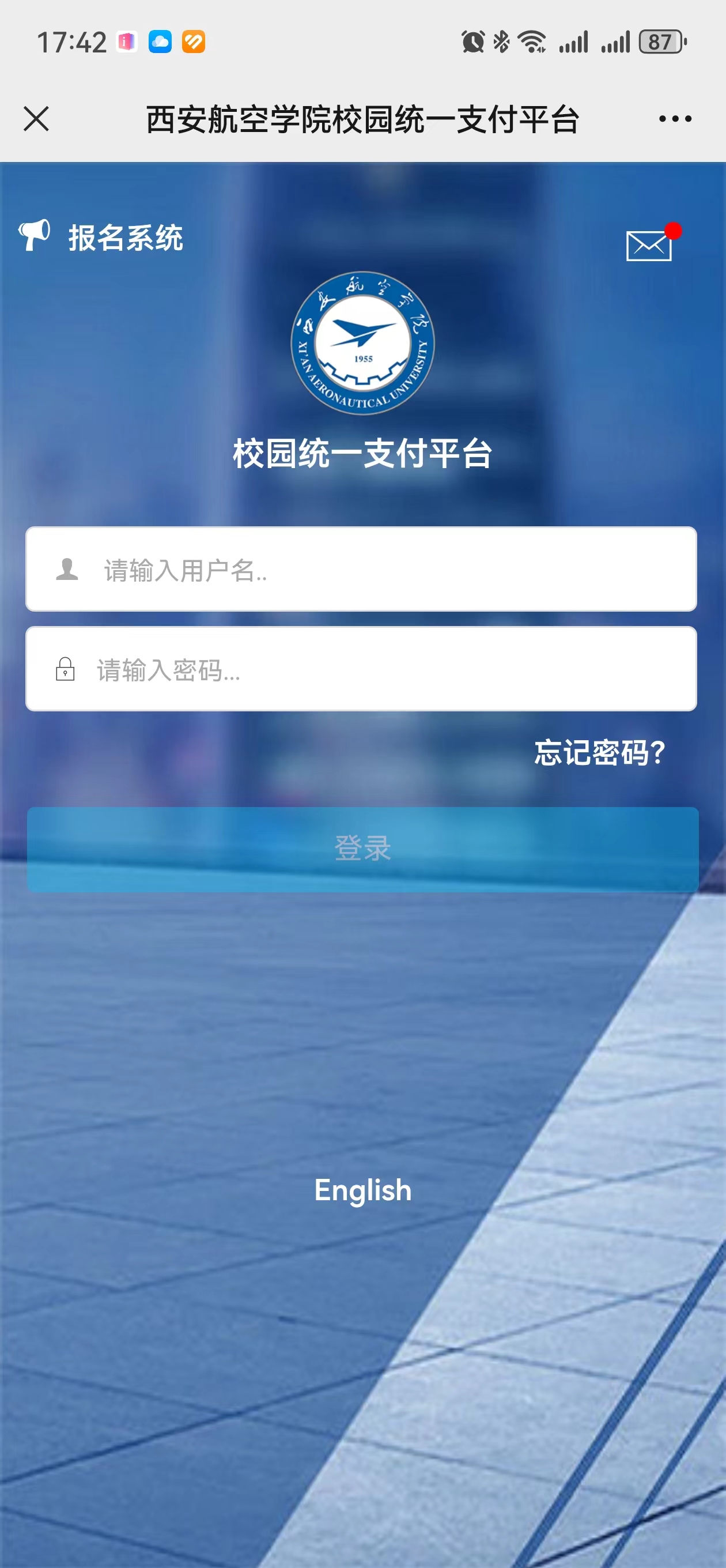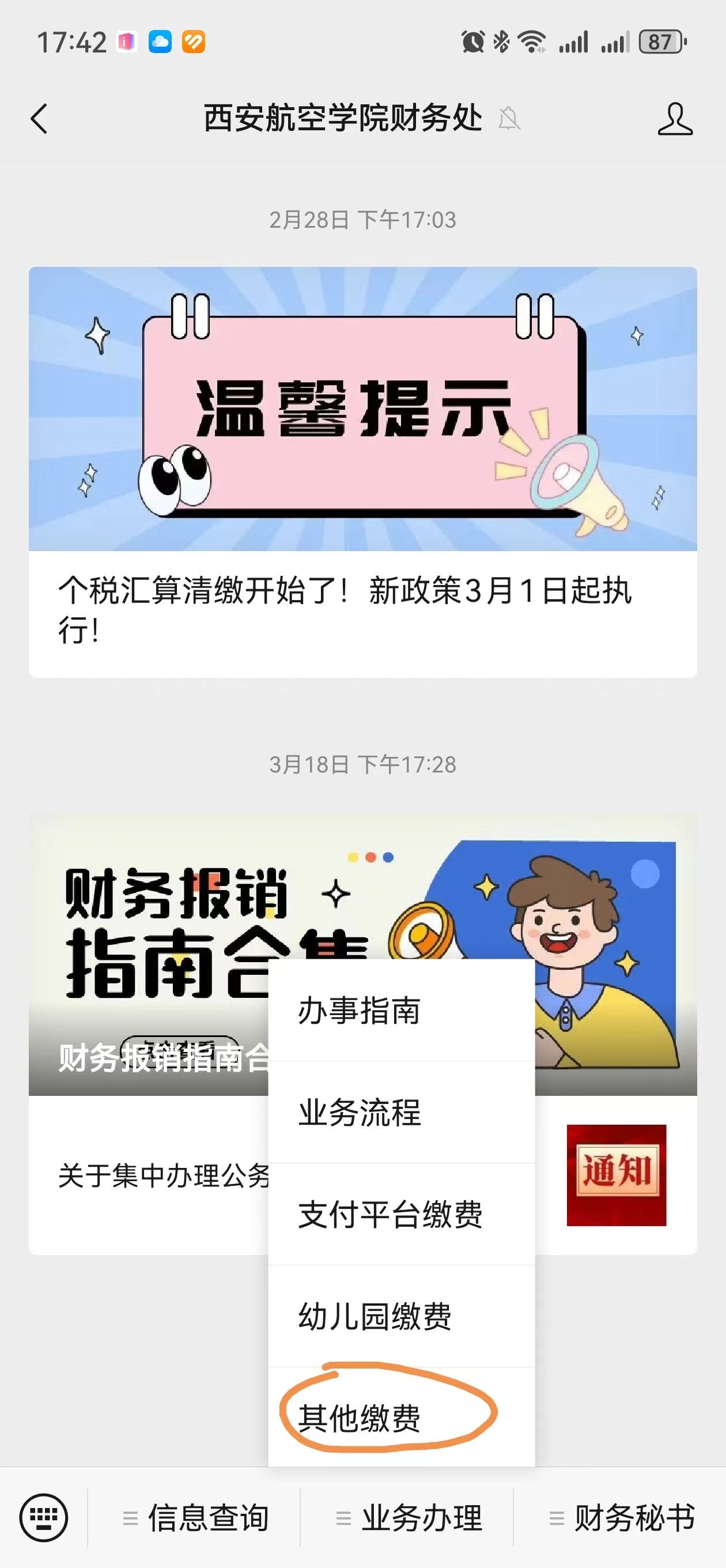 关注后点击“业务办理”、“其他缴费”,进入今年会官方网站“校园统一支付平台”,输入账号、密码进行登录。